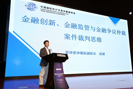 2018年7月7日,由北京市法學會物權法研究會和大成律師事務所聯(lián)合主辦的“金融嚴監(jiān)管下的爭議解決之道——‘金融創(chuàng)新’中的風險應對高端論壇”在北京國家會議中心舉行。北京市法學會物權法研究會副秘書長李昊,貿(mào)仲委仲裁員馬江濤致開幕辭。來自全國各地的律師及媒體記者共260余人參加了本次會議。貿(mào)仲委仲裁院副院長趙健受邀參加本次論壇,并以“金融創(chuàng)新、金融監(jiān)管及金融爭議仲裁案件裁判思維”為題作專題報告。