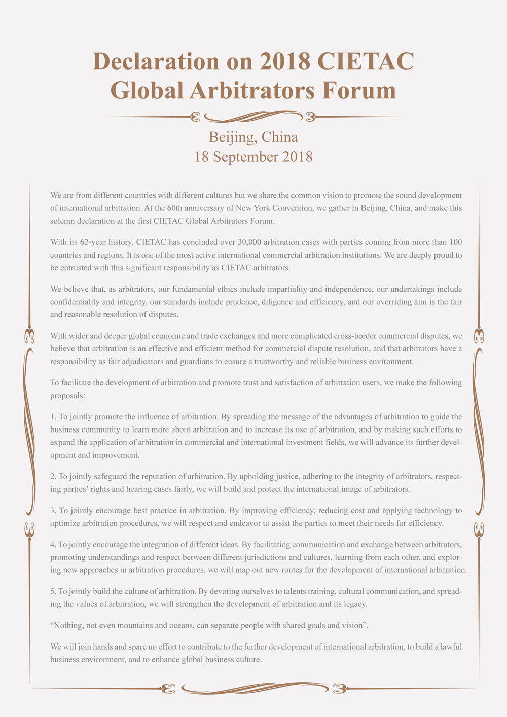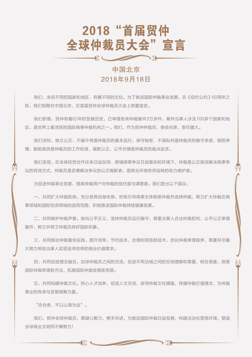 中國國際經(jīng)濟(jì)貿(mào)易仲裁委員會(簡稱“貿(mào)仲”)于2018年9月18日在中國北京舉行2018“首屆貿(mào)仲全球仲裁員大會”,并發(fā)表宣言如下: