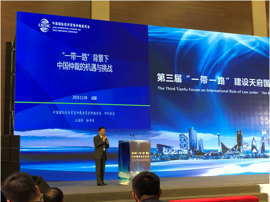 2018年11月4日下午,由四川省政府國有資產(chǎn)監(jiān)督管理委員會、四川省經(jīng)濟(jì)和信息化委員會、四川省司法廳共同指導(dǎo),中國政法大學(xué)“一帶一路”法律研究中心、四川省企業(yè)聯(lián)合會/四川省企業(yè)家協(xié)會、四川省律師協(xié)會共同主辦的第三屆“一帶一路”建設(shè)天府國際法治論壇在成都舉行。