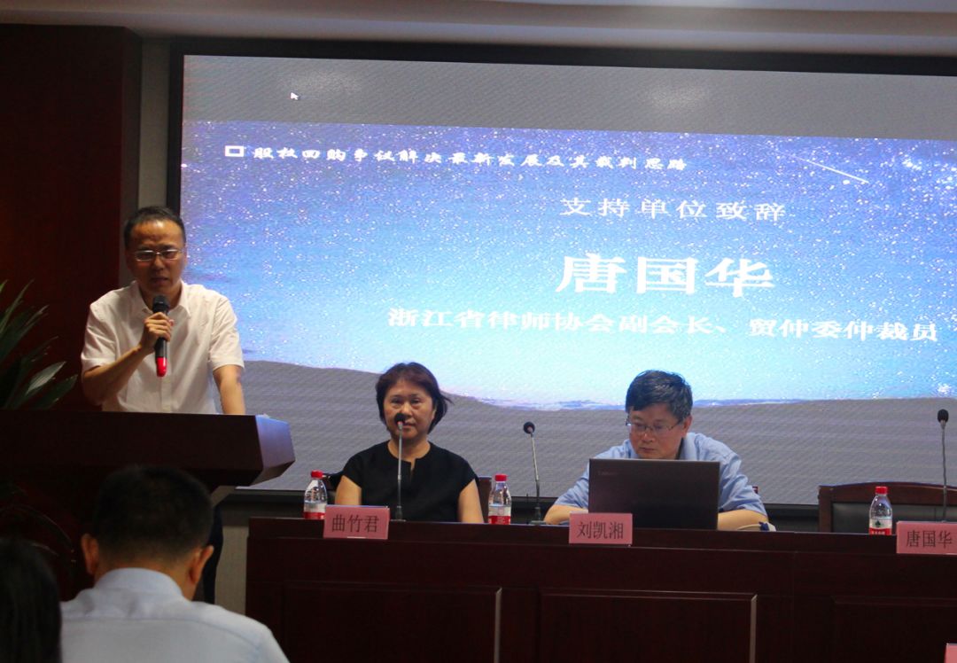 貿仲委仲裁員、浙江省律師協(xié)會副會長唐國華先生代表支持單位為本次活動致詞。唐會長從律師的角度簡略介紹了股權回購條款的適用現(xiàn)狀和爭議解決要點,并代表浙江律協(xié)和律師熱烈歡迎劉凱湘教授此次蒞臨浙江。