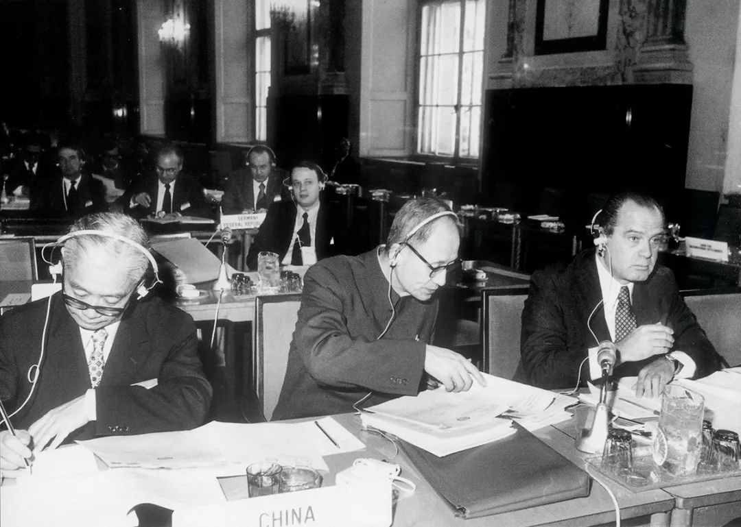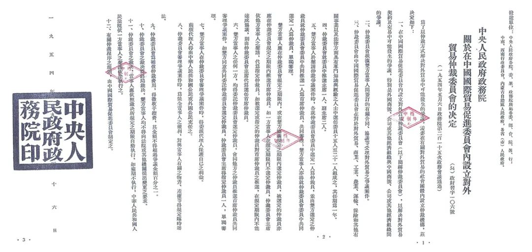 圖為1954年5月6日,中央人民政府政務(wù)院在第215次政務(wù)會(huì)議上正式通過(guò)了《中央人民政府政務(wù)院關(guān)于在中國(guó)國(guó)際貿(mào)易促進(jìn)委員會(huì)內(nèi)設(shè)立對(duì)外貿(mào)易仲裁委員會(huì)的決定》。