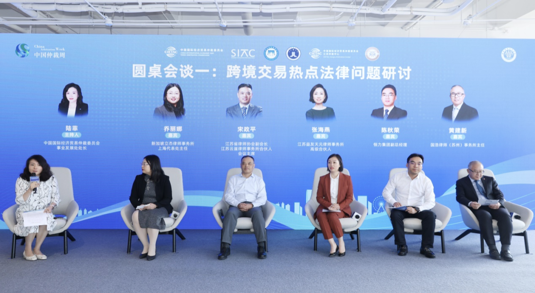 (從左到右依次為由貿(mào)仲事業(yè)發(fā)展處處長陸菲,新加坡立杰律師事務(wù)所上海代表處主任喬麗娜,貿(mào)仲仲裁員、江蘇省律師協(xié)會(huì)副會(huì)長、江蘇云崖律師事務(wù)所合伙人會(huì)議主席宋政平,江蘇益友天元律師事務(wù)所高級合伙人張海燕,恒力集團(tuán)副總經(jīng)理陳秋榮,國浩律師(蘇州)事務(wù)所主任黃建新)