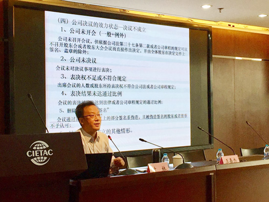 2017年9月27日下午,貿(mào)仲委舉辦“第十四期仲裁員暨委員講壇”,邀請(qǐng)中國(guó)人民大學(xué)教授、貿(mào)仲委仲裁員葉林為廣大仲裁員、律師及法律工作者解讀最新出臺(tái)的《最高人民法院關(guān)于適用<中華人民共和國(guó)公司法>若干問題的規(guī)定(四)》(以下簡(jiǎn)稱“《公司法解釋(四)》”),并以“結(jié)合公司法解釋(四)談股東權(quán)利保護(hù)”為主題作專題講座。中國(guó)通用技術(shù)集團(tuán)原總法律顧問、貿(mào)仲委仲裁員王嘉杰主持講壇活動(dòng)。