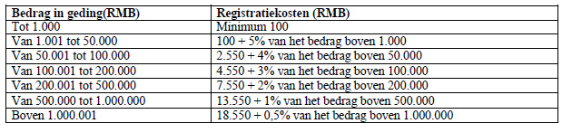 Wanneer een zaak aanvaard wordt, zal een bijkomend bedrag van 10.000 RMB opgelegd worden voor de registratiekosten, dat de uitgaven omvat voor het onderzoek van het verzoek tot arbitrage, het opstarten van de scheidsrechterlijke procedure, de behandeling per computer en het opslaan van de processtukken.