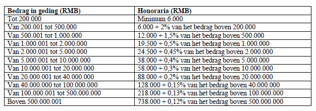2.Tenzij in onderhavige tarieflijst anders bepaald, zullen de honoraria van de arbiters bepaald worden door de CIETAC op grond van de bovenstaande tabel, gelet op de omstandigheden van de zaak. De onkosten van de arbiters zullen alle redelijke, werkelijke uitgaven omvatten, die als gevolg van de activiteiten van de arbiters in de arbitragezaak gedaan werden.