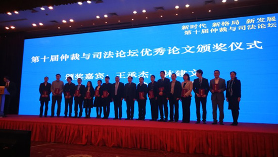 論壇閉幕式上,王承杰秘書長還作為頒獎嘉賓為獲得優(yōu)秀論文獎的作者頒獎。此次論文評選吸引了眾多學者、仲裁員、律師的踴躍參與,內容涵蓋了自貿區(qū)經貿糾紛解決、“一帶一路”糾紛解決、國際投資仲裁、網上仲裁等法律熱點問題。