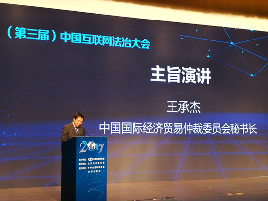 2017年12月15日,貿(mào)仲委副主任、秘書長王承杰出席了第三屆中國互聯(lián)網(wǎng)法治大會開幕式并做主旨演講。該會議由中國互聯(lián)網(wǎng)協(xié)會攜北京外國語大學(xué)主辦,會議主題為“建設(shè)網(wǎng)絡(luò)強國,共建法治生態(tài)”。
