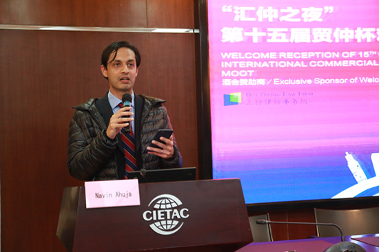 貿仲杯評委、來自英國的具有豐富經驗的律師Navin Ahuja代表評委表達了對本屆貿仲杯的期待以及對貿仲杯參賽隊員的期許。