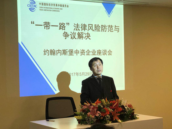 2018年5月29日,中國(guó)國(guó)際經(jīng)濟(jì)貿(mào)易仲裁委員會(huì)(貿(mào)仲委)在南非首都約翰內(nèi)斯堡舉辦了中資企業(yè)座談會(huì),會(huì)議主題為”‘一帶一路’法律風(fēng)險(xiǎn)防范與爭(zhēng)議解決”。中國(guó)駐約翰內(nèi)斯堡總領(lǐng)事館副總領(lǐng)事任曉霞和貿(mào)仲委副主任兼秘書(shū)長(zhǎng)王承杰出席會(huì)議并致辭。中國(guó)貿(mào)促會(huì)駐南非代表處代表劉巖主持座談會(huì)。