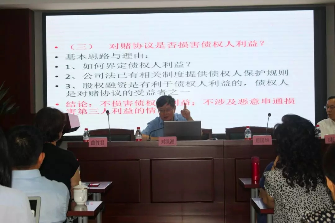 劉凱湘教授的講座在熱烈的現(xiàn)場氛圍中進行。首先,劉教授列舉了股權回購協(xié)議在實踐中幾種常見的類型與模式,簡要地對這些類型進行了描述,也指出了學界對股權回購協(xié)議性質的不同理解。然后,劉教授歸納了“對賭第一案”各次審判的裁判要旨,緊接著,他從貿仲委作出的裁決案例出發(fā),詳細講解了影響股權回購協(xié)議效力認定的諸因素,同時提出了解決此類糾紛各個難點焦點爭議的裁判思路。最后,劉教授參照法院最新案例的裁判要旨和立法的最新動態(tài),對股權回購協(xié)議效力認定的發(fā)展變遷與最新態(tài)勢進行了概括。