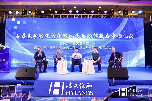 在圓桌討論環(huán)節(jié),浩天信和北京總部合伙人董浩文先生作為主持人以 “私募基金的風(fēng)險(xiǎn)合規(guī)以及后法律服務(wù)市場機(jī)會(huì)”為題分別對(duì)特邀嘉賓:溫氏食品集團(tuán)股份有限公司董事總經(jīng)理曾巍先生、深圳穗甬匯智投資管理有限公司合伙人楊志勝先生、北京尚融資本管理有限公司合伙人萬洪春先生、浩天信和深圳辦公室合伙人張樂熊先生進(jìn)行了提問,四位嘉賓根據(jù)各自的行業(yè)經(jīng)驗(yàn)就私募基金的背景、特點(diǎn)與優(yōu)勢、私募基金風(fēng)險(xiǎn)暴露的必然、股權(quán)投資的邏輯、投資中的風(fēng)險(xiǎn)、不同經(jīng)濟(jì)形勢之下私募基金對(duì)于投資的關(guān)注重點(diǎn)、私募基金面臨的法律風(fēng)險(xiǎn)等問題發(fā)表了專業(yè)意見。