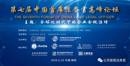 2019年11月23日,第七屆中國首席法務(wù)官高峰論壇在深圳麗雅查爾頓酒店隆重舉行,近四百位企業(yè)法務(wù)負(fù)責(zé)人參與本次盛會(huì)。此次論壇由中國首席法務(wù)官研究院、中國國際經(jīng)濟(jì)貿(mào)易仲裁委員會(huì)/中國海事仲裁委員會(huì)華南分會(huì)聯(lián)合主辦,深圳市律師協(xié)會(huì)、中國國際經(jīng)濟(jì)貿(mào)易仲裁委員會(huì)/中國海事仲裁委員會(huì)香港仲裁中心、安理國際律師事務(wù)所、北京天達(dá)共和(深圳)律師事務(wù)所、北京市君澤君(深圳)律師事務(wù)所、深圳華夏泰和知識(shí)產(chǎn)權(quán)有限公司協(xié)辦,此外還獲得了《人民法治》雜志社、西南政法大學(xué)中國法治企業(yè)研究院、深圳市南山區(qū)風(fēng)險(xiǎn)管理協(xié)會(huì)的大力支持。經(jīng)過行業(yè)大咖一天精彩內(nèi)容的分享,論壇圓滿結(jié)束。