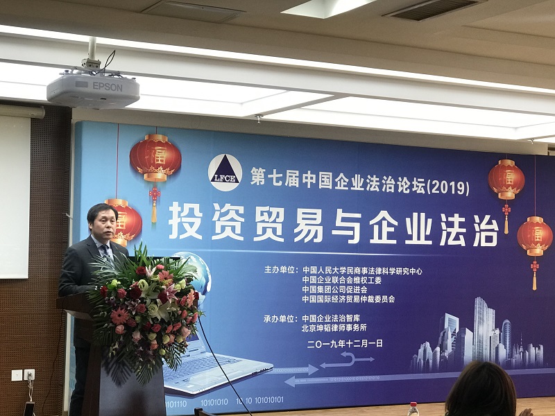 2019年12月1日,由中國(guó)人民大學(xué)民商事法律科學(xué)研究中心、中國(guó)企業(yè)聯(lián)合會(huì)維權(quán)工作委員會(huì)、中國(guó)集團(tuán)公司促進(jìn)會(huì)和中國(guó)國(guó)際經(jīng)濟(jì)貿(mào)易仲裁委員會(huì)共同主辦的第七屆中國(guó)企業(yè)法治論壇在中國(guó)人民大學(xué)成功舉辦。本屆論壇的主題是“投資貿(mào)易與企業(yè)法治”,旨在通過(guò)貫徹落實(shí)十九大、十九屆四中全會(huì)、中共中央、國(guó)務(wù)院《關(guān)于推進(jìn)貿(mào)易高質(zhì)量發(fā)展的指導(dǎo)意見(jiàn)》關(guān)于企業(yè)改革發(fā)展、投資貿(mào)易、建設(shè)法治國(guó)家的要求,共同思考和研究新時(shí)代企業(yè)改革發(fā)展、投資貿(mào)易的法律政策、體制機(jī)制、運(yùn)作模式等突出問(wèn)題,為企業(yè)加強(qiáng)投資貿(mào)易,促進(jìn)企業(yè)高質(zhì)量發(fā)展建言獻(xiàn)策。