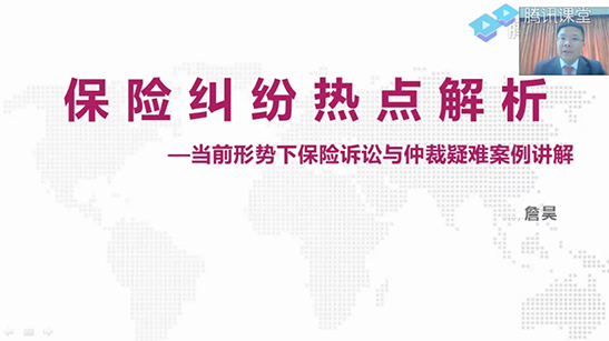 第二期講座邀請貿(mào)仲委仲裁員、錢伯斯十年推薦第一等保險律師、安杰律師事務所合伙人詹昊講授保險糾紛熱點問題。詹昊先生首先簡要介紹了保險爭議的特點與現(xiàn)狀,深入細致闡述了因新冠疫情導致營業(yè)中斷險承保范圍等實踐相關問題。隨后,詹昊先生通過梳理和總結多年保險案件實戰(zhàn)經(jīng)驗,以真實生動的案例,生動講解了如實告知義務、明確說明義務、不利解釋原則、近因原則等保險領域熱點問題的最新發(fā)展狀況。