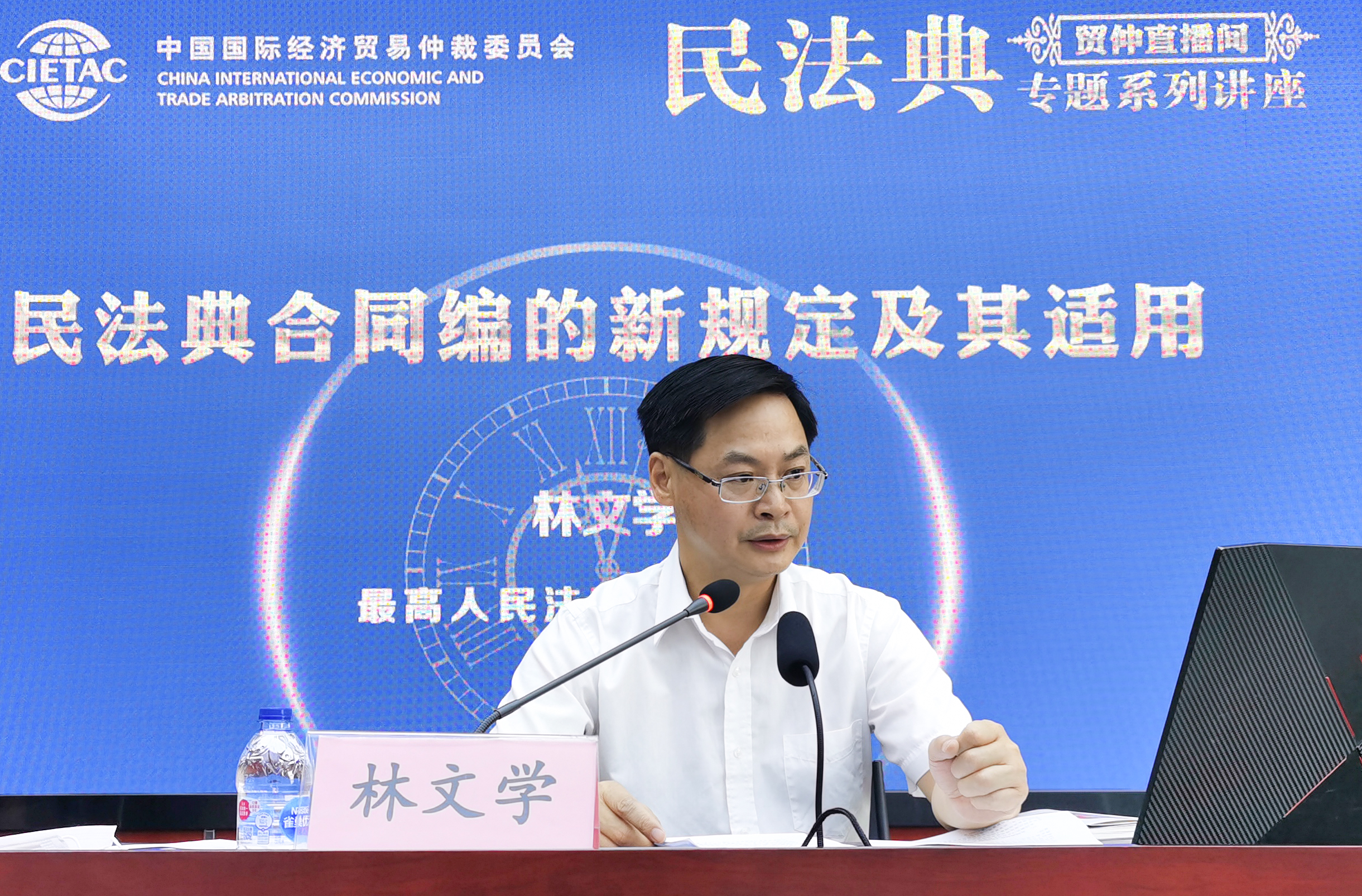 2020年6月29日,由中國國際經濟貿易仲裁委員會(以下簡稱“貿仲”)舉辦的“貿仲直播間”公益講座《民法典》專題系列第九講如期舉行。本期講座貿仲邀請了最高人民法院民二庭庭長林文學圍繞“民法典《合同編》的新規(guī)定及其適用”面向貿仲仲裁員作主題演講。