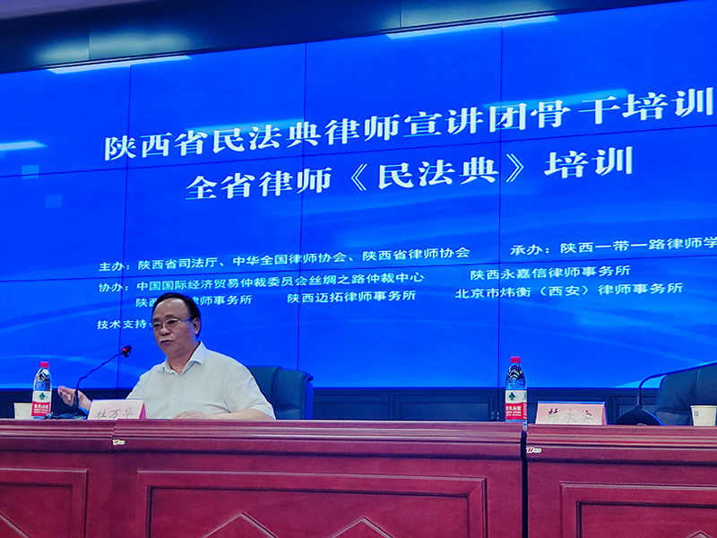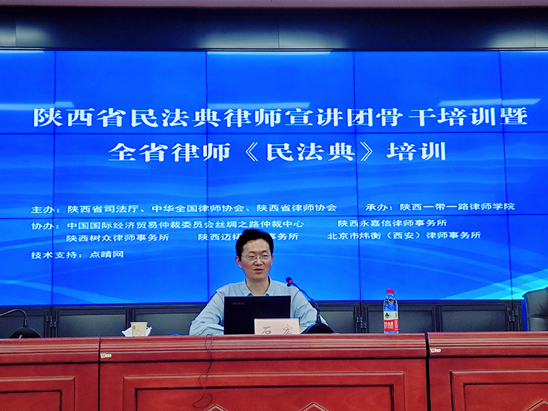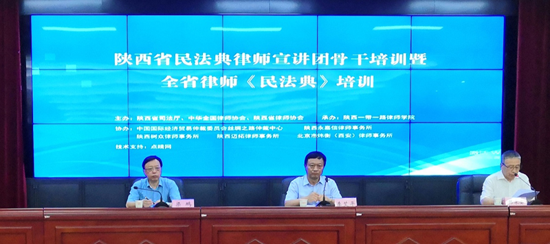 8月1日-2日,由陜西省司法廳、中華全國律師協(xié)會、陜西省律師協(xié)會聯(lián)合主辦,陜西“一帶一路”律師學(xué)院承辦,中國國際經(jīng)濟(jì)貿(mào)易仲裁委員會絲綢之路仲裁中心、陜西永嘉信律師事務(wù)所、陜西樹眾律師事務(wù)所、陜西邁拓律師事務(wù)所、北京市煒衡(西安)律師事務(wù)所協(xié)辦,點(diǎn)睛網(wǎng)技術(shù)支持的陜西省民法典律師宣講團(tuán)骨干培訓(xùn)暨全省律師《民法典》培訓(xùn)活動在陜西省司法廳順利舉行。