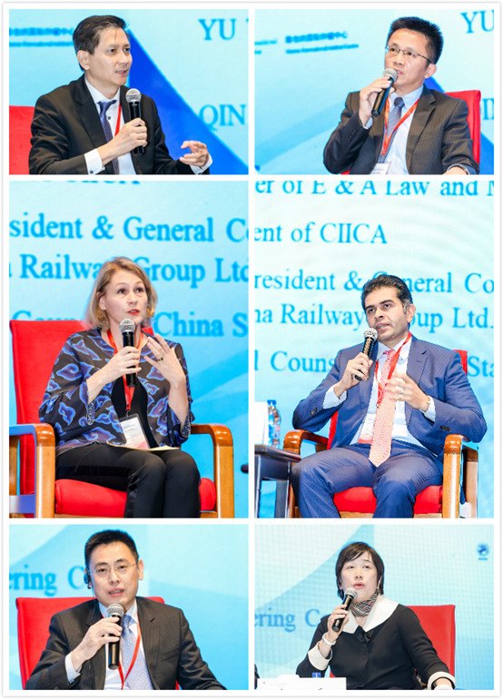 (從上到下、從左到右依次為:新加坡國際仲裁中心(SIAC)副主席Leng Sun CHAN先生、國家開發(fā)銀行法律合規(guī)局副局長孟剛先生、英國E&A律師事務(wù)所創(chuàng)始合伙人、海牙常設(shè)仲裁院(PCA)委員Ana STANIC女士、巴基斯坦國際投資及商事仲裁中心(CIICA)主席Rana SAJJAD先生、中國中鐵股份有限公司副總裁和總法律顧問于騰群先生、中國建筑股份有限公司總法律顧問秦玉秀女士)