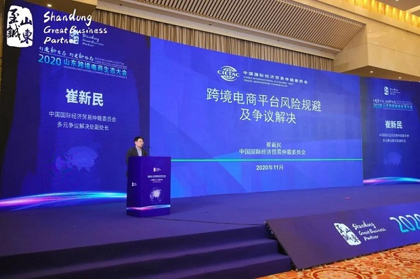 2020年11月25日,“2020山東跨境電商生態(tài)大會”在山東省濟南市山東大廈成功舉辦。本次大會由山東省商務(wù)廳主辦,中國國際經(jīng)濟貿(mào)易仲裁委員會山東分會(簡稱“貿(mào)仲山東分會”)、中國建設(shè)銀行山東省分行、中國郵政集團有限公司山東省分公司、阿里巴巴中小企業(yè)國際貿(mào)易事業(yè)部協(xié)辦。山東省政協(xié)副主席王藝華、商務(wù)部配額許可證事務(wù)局副局長吳彬出席大會并致辭,山東省商務(wù)廳副廳長呂偉發(fā)布山東省跨境電商等新業(yè)態(tài)提升發(fā)展三年計劃。