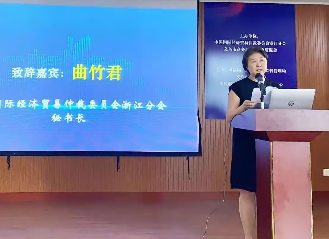 貿(mào)仲浙江分會秘書長曲竹君、義烏市商務(wù)局副局長朱曉棠出席會議并致辭。義烏市司法局黨組成員、副局長黃以軍以及義烏市人民法院等法律界及企業(yè)界120余人參加了研討會。