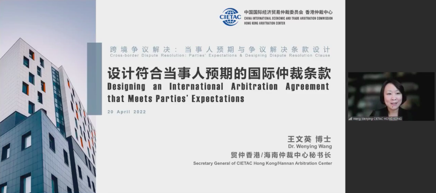 2022年4月20日,中國國際經(jīng)濟貿(mào)易仲裁委員會(“貿(mào)仲”)香港仲裁中心秘書長王文英博士應(yīng)邀參加了由中國金融投資爭議解決論壇 (CFFID)、英國其禮律師事務(wù)所和律商聯(lián)訊(LexisNexis)聯(lián)合舉辦的跨境爭議解決系列論壇第一期:“跨境爭議解決:當(dāng)事人預(yù)期與爭議解決條款設(shè)計”專題研討會,并發(fā)表主題演講。