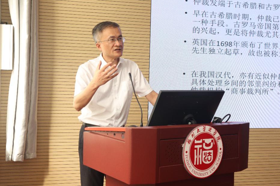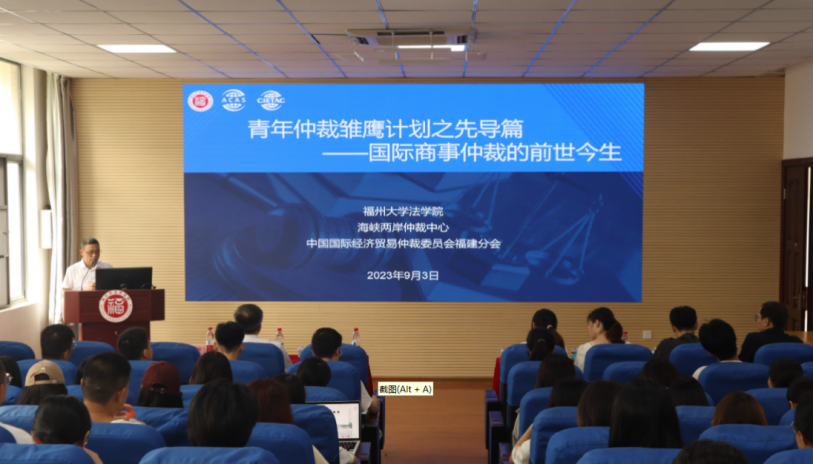 在演講環(huán)節(jié),貿(mào)仲福建分會秘書長、海峽兩岸仲裁中心副秘書長陳朝暉以“國際商事仲裁最新發(fā)展”為題,從商事仲裁的起源和分類、主要商事仲裁機(jī)構(gòu)的數(shù)據(jù)、國際商事仲裁的地位和發(fā)展趨勢、我國仲裁的國家隊等方面講述了商事仲裁的前世今生。他表示,商事仲裁是化解國際經(jīng)濟(jì)貿(mào)易爭議的重要手段。當(dāng)前國際商事仲裁中心日益呈現(xiàn)自西向東的發(fā)展趨勢。貿(mào)仲作為全球五大最受歡迎的國際商事仲裁機(jī)構(gòu),海峽兩岸仲裁中心作為唯一主要化解兩岸經(jīng)貿(mào)爭議的國家級仲裁機(jī)構(gòu),在服務(wù)一帶一路建設(shè)和兩岸經(jīng)貿(mào)往來,化解跨區(qū)域經(jīng)貿(mào)爭議方面具有天然優(yōu)勢。他還鼓勵同學(xué)們積極通過貿(mào)仲福建分會和海峽兩岸仲裁中心平臺深入了解仲裁實(shí)踐。