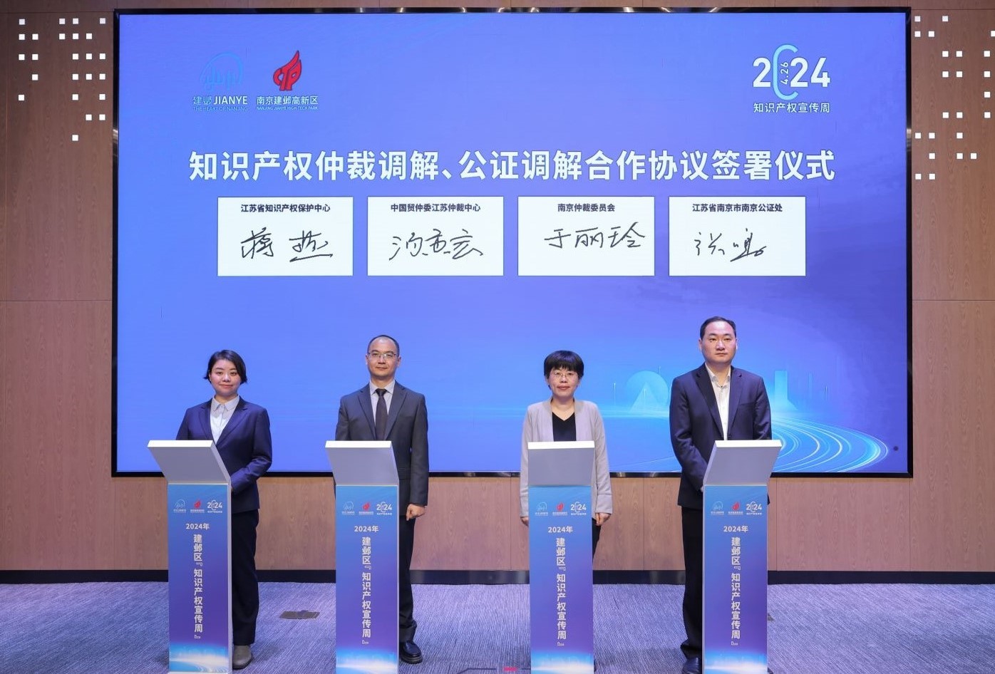 2024年4月23日,由江蘇省知識產(chǎn)權(quán)保護中心和南京市市場監(jiān)督管理局指導、南京市建鄴區(qū)市場監(jiān)督管理局和南京建鄴高新技術產(chǎn)業(yè)開發(fā)區(qū)管委會主辦的“構(gòu)建知識產(chǎn)權(quán)新生態(tài) 激發(fā)區(qū)域經(jīng)濟新活力”知識產(chǎn)權(quán)宣傳周活動在南京成功舉辦。中國國際經(jīng)濟貿(mào)易仲裁委員會江蘇仲裁中心(以下簡稱“貿(mào)仲江蘇中心”)應邀參加,并與江蘇省知識產(chǎn)權(quán)保護中心簽署《知識產(chǎn)權(quán)糾紛調(diào)解框架合作協(xié)議》。南京市建鄴區(qū)委常委、副區(qū)長馬友君為活動致辭。共有來自知識產(chǎn)權(quán)服務機構(gòu)相關領導、專家學者、企業(yè)負責人等近100人參加活動。