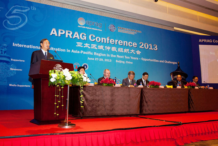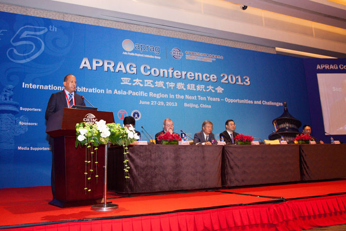 2013年6月27-29日,由中國國際經(jīng)濟(jì)貿(mào)易仲裁委員會(簡稱“中國貿(mào)仲委”)主辦的2013年亞太區(qū)域仲裁組織(APRAG)大會在北京隆重召開。最高人民法院院長、首席大法官周強(qiáng)出席大會開幕式并做主旨演講。中國國際貿(mào)易促進(jìn)委員會/中國國際商會會長,中國貿(mào)仲委主任、中國海仲委主任萬季飛代表主辦方致歡迎詞,亞太區(qū)域仲裁組織主席馬來西亞吉隆坡區(qū)域仲裁中心主席Sundra Rajoo代表APRAG致歡迎詞;聯(lián)合國國際貿(mào)易法委員會秘書長Renaud Sorieul和中華人民共和國香港特別行政區(qū)政府律政司司長袁國強(qiáng)應(yīng)邀出席開幕式并致辭。全國人大常委會法工委副主任王勝明,中國國際貿(mào)易促進(jìn)委員會/中國國際商會副會長、中國貿(mào)仲委副主任、中國海仲委副主任、亞太區(qū)域仲裁組織2013年大會組委會主席董松根,國務(wù)院法制辦副主任夏勇,中國法學(xué)會秘書長林中梁,中華全國律師協(xié)會會長王俊峰,國務(wù)院法制辦協(xié)調(diào)司巡視員盧云華,全國人大常委會法工委民法室主任賈東明,司法部法制司司長陳俊生等出席開幕式。來自26個國家和地區(qū)的中外知名仲裁機(jī)構(gòu)的負(fù)責(zé)人、仲裁員、律師合伙人、企業(yè)界代表等近400人參加會議。全國律協(xié)、中國銀行業(yè)協(xié)會、中國建筑業(yè)協(xié)會和北京律師協(xié)會作為本次大會的支持單位。中國貿(mào)仲委副主任兼秘書長、中國海仲委副主任于健龍主持開幕式。