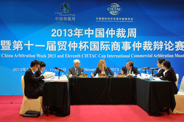 2013年11月18-22日,貿(mào)仲委在京成功舉辦了第十一屆“貿(mào)仲杯”國際商事仲裁辯論賽。本屆辯論賽吸引了來自國內(nèi)29所著名高等院校法學(xué)院(系)代表隊的200多名選手參加比賽。包括7名外籍律師和仲裁員在內(nèi)的40余名仲裁員及國內(nèi)外知名律師應(yīng)邀擔(dān)任評委。